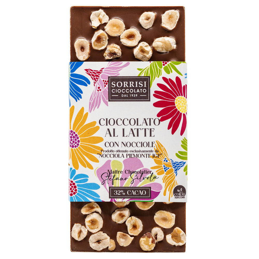 Der dunkle Schokoladenriegel mit halben Piemont IGP Haselnüssen von Boella & Sorrisi vereint feinste italienische Handwerkskunst mit intensiven Aromen aus nachhaltigem Kakaoanbau.